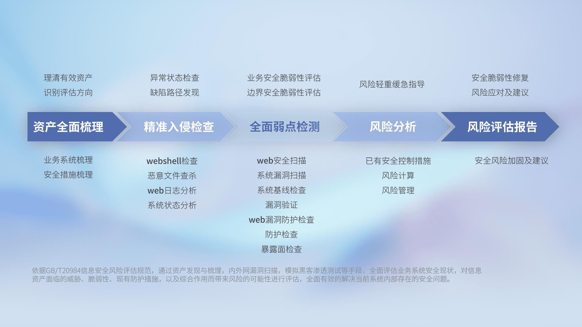 针对客户行业特性,,,以专业的安全服务+多厂商联合解决方案提供专属的一站式安全管理服务,,,,帮助客户全面感知网络空间威胁,,,基于识别、、检测、、、分析、、、、防护、、监测、、、响应的服务理论模型,,,从方案咨询、、、集成交付、、、、评估验证、、优化加固、、、、运维运营,,致力于为客户提供完整的闭环管理式安全服务。。。以实战经验为客户打造高抵御风险的安全体系,,帮助客户发现威胁、、对抗威胁、、、、处置威胁,,不断积累安全对抗能力,,,持续保障数字化安全。。