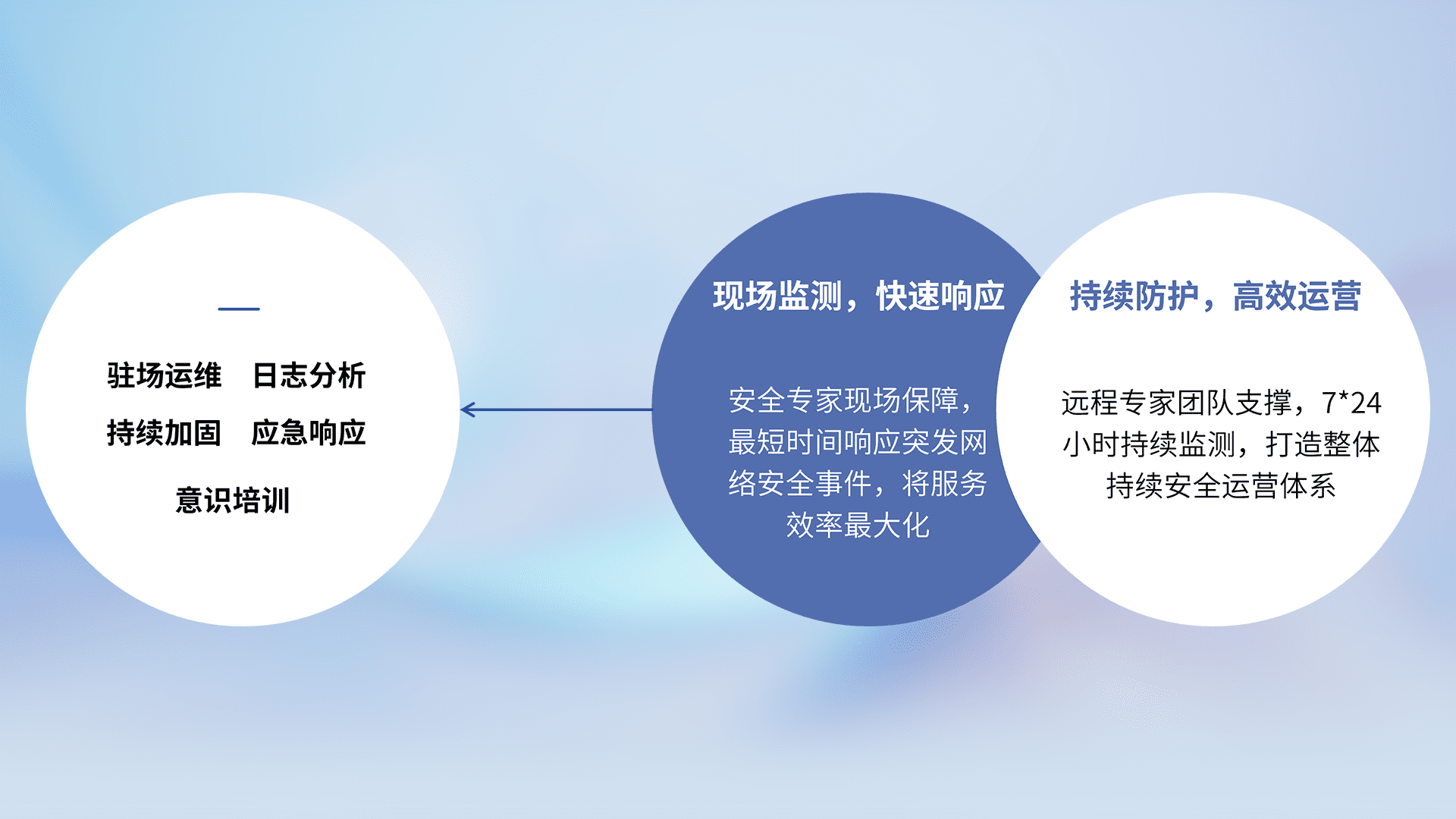 针对客户行业特性,,,,提供专属的一站式安全管理服务,,,帮助客户全面感知网络空间威胁,,,通过安全专家的线上、、、线下防护支持,,,,实现风险闭环,,,,将安全保障常态化,,,,为客户打造常态化安全运维运营服务。。。